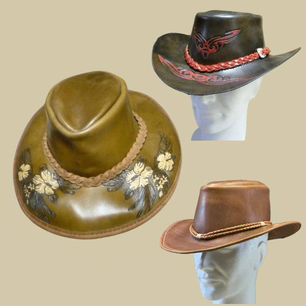 La technique du chapeau en cuir est surtout présente en Australie. Le Petit Atelier du Cuir réalise des chapeaux dans cet esprit. Ils sont confectionné à la demande à vos dimensions et personnalisables. Ils seront parfaitement adapté pour les randonnées ou excursion équestre.