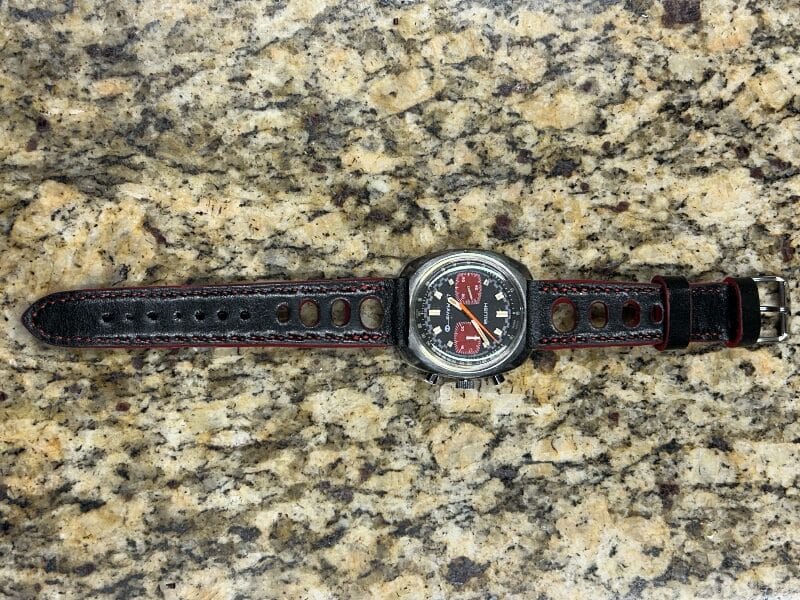 Le bracelet est constitué de deux types de cuir différents : un cuir de veau noir sur le dessus et un cuir d’agneau rouge foncé en dessous. Un rappel de tranche de la même couleur rouge. Pour compliquer le tout, le bracelet est ajouré avec des trous ovales décroissants. Pour pimenter le tout, la couture est réalisée en bicolore.