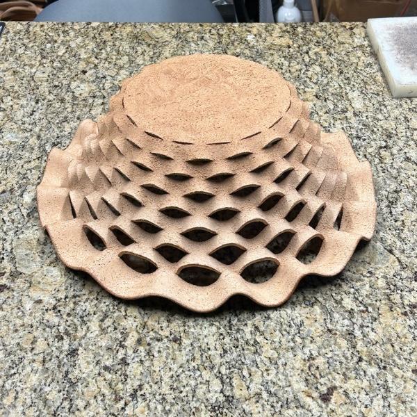 Le défi était de créer en une seule pièce une panière. Le calcul des angles des entailles et leurs positionnements ont été réalisés sur une grande feuille souple afin de pouvoir effectuer le report sur la pièce. Les incisions doivent être alternées et de façon concentrique pour déployer le cuir tout en conservant une certaine solidité.